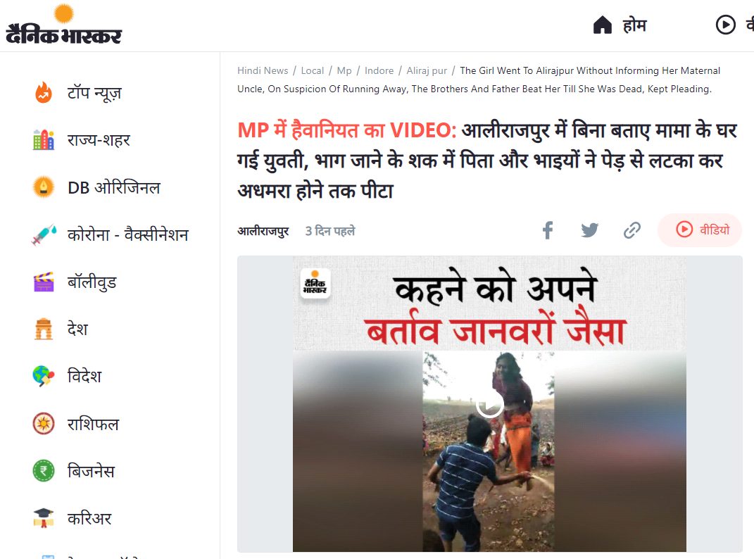 हमने पाया कि लड़की की बेरहमी से पिटाई करने वाले 3 वीडियोज़ एक ही घटना से संबंधित हैं. की-वर्ड्स सर्च करने पर हमें कुछ न्यूज़ आर्टिकल मिले. 2 जुलाई 2021 की दैनिक भास्कर की रिपोर्ट में ये घटना मध्यप्रदेश में आलीराजपुर के फूटतालब की बताई गई है. आर्टिकल के मुताबिक, लड़की को पीटने वाले लोग उसके परिवारवाले ही थे और वो लड़की के बिना बताए मामा के घर चले जाने से नाराज़ होकर उसे मार रहे थे. आर्टिकल में लिखा है – “घटना ज़िला मुख्यालय से करीब 50 किमी दूर बोरी थाने के बड़े फुटतालाब गांव की है. गांव में रहने वाली नानसी (19) पिता केल सिंह की शादी पास के गावं भूरछेवड़ी में की गई थी. कुछ दिन पहले नानसी का पति मजदूरी करने के लिए गुजरात चला गया. वह पत्नी को ससुराल में ही छोड़ गया. इसी से नाराज होकर वह ससुराल में बिना बताए आंबी गांव में अपने मामा के यहां चली गई. यह बात नानसी के मायके वालों को पता चली. वह इस बात से बहुत नाराज थे. उन्हें लगा कि युवती घर से भाग गई है. वह उसे 28 जून को वापस फुटतालाब ले आए. इसके बाद इसी बात पर शाम करीब 5 बजे उसकी जमकर पिटाई की.”