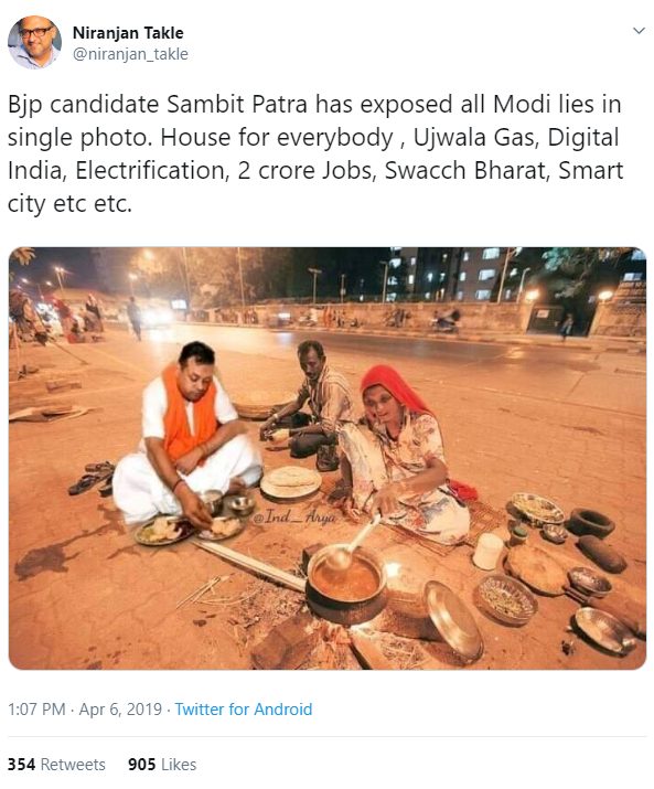 भाजपा प्रवक्ता संबित पात्रा की एक बेघर दंपती के साथ कथित तौर पर फुटपाथ पर खाना खाते हुए एक तस्वीर सोशल मीडिया में चल रही है। उसी तस्वीर को पोस्ट करते हुए, पत्रकार निरंजन टाकले ने मोदी सरकार को यह कहते हुए आड़े हाथ लिया, “भाजपा उम्मीदवार संबित पात्रा ने एक ही तस्वीर में मोदी के सभी झूठ का पर्दाफाश किया है। सबके लिए घर, उज्ज्वला गैस, डिजिटल इंडिया, विद्युतीकरण, 2 करोड़ नौकरियां, स्वच्छ भारत, स्मार्ट सिटी आदि।” – (अनुवाद) बाद में, इस ट्वीट को हटा दिया गया। ट्वीट का अर्काइव्ड संस्करण यहां देखा जा सकता है।