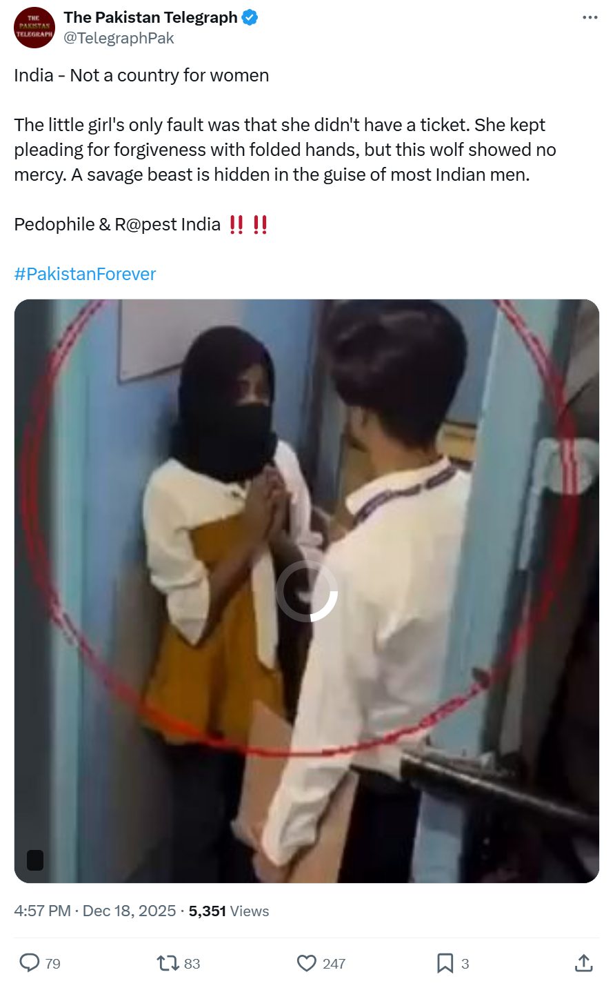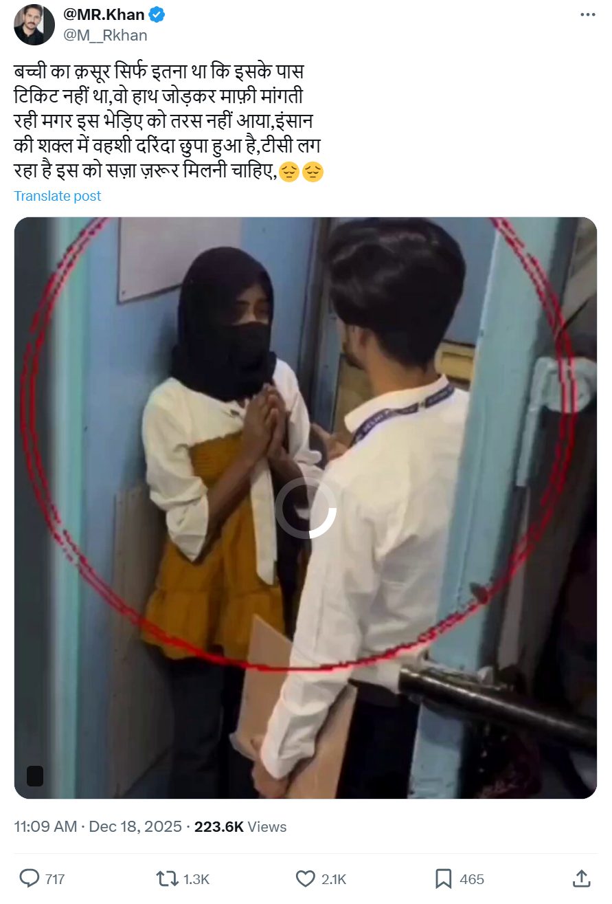 ‘MR.KHAN’ नाम के एक X हैंडल ने वायरल वीडियो पोस्ट करते हुए लिखा कि बच्ची का क़सूर सिर्फ इतना था कि इसके पास टिकट नहीं था, वो हाथ जोड़कर माफ़ी मांगती रही. लेकिन टीसी को तरस नहीं आया, वो इंसान की शक्ल में छुपा हुआ दरिंदा है. (आर्काइव लिंक)