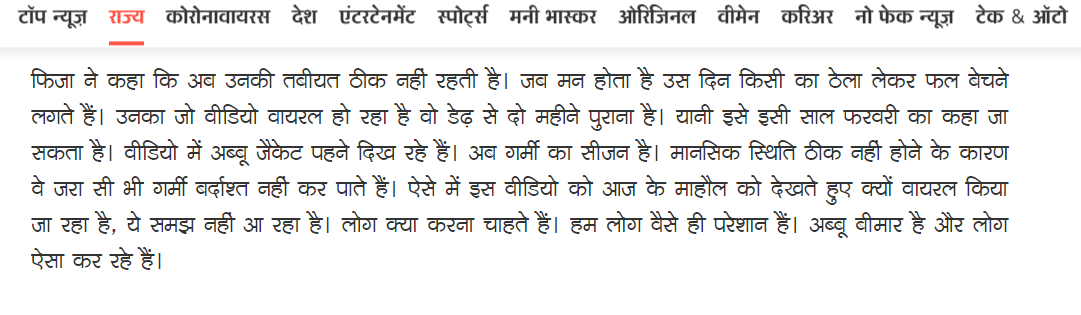 ऑल्ट न्यूज़ ने पाया कि ये वीडियो मध्य प्रदेश के रायसेन में फ़रवरी 2020 को हुई घटना का है. गूगल पर की-वर्ड्स से सर्च करने पर 3 अप्रैल 2020 की ‘दैनिक भास्कर’ की रिपोर्ट मिली. रिपोर्ट के मुताबिक, वीडियो में दिख रहा व्यक्ति शेरू खान रायसेन का रहने वाला है. वो मेन मार्केट में अपना ठेला लगाते है. 3 अप्रैल 2020 को इस ठेले वाले के खिलाफ़ भारतीय दंड संहिता की धारा 269 और 270 के तहत मामला दर्ज़ किया गया.