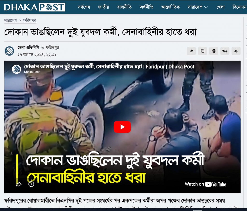 जांच के दौरान बांग्लादेशी मीडिया आउटलेट ‘Dhaka Post‘ की 17 अगस्त 2024 को प्रकाशित एक रिपोर्ट मिली. इसमें वीडियो दिखाते हुए बताया गया कि 14 अगस्त 2024 को फरीदपुर के बोआलमारी में दो गुटों के बीच हुई झड़प के बाद बांग्लादेश नेशनलिस्ट पार्टी (BNP) कार्यकर्ताओं ने एक पार्टी की दुकानों में तोड़फोड़ की. बाद में सेना ने दो लोगों को हिरासत में लिया है. घटना का वीडियो 17 अगस्त को सोशल मीडिया पर वायरल हो गया.