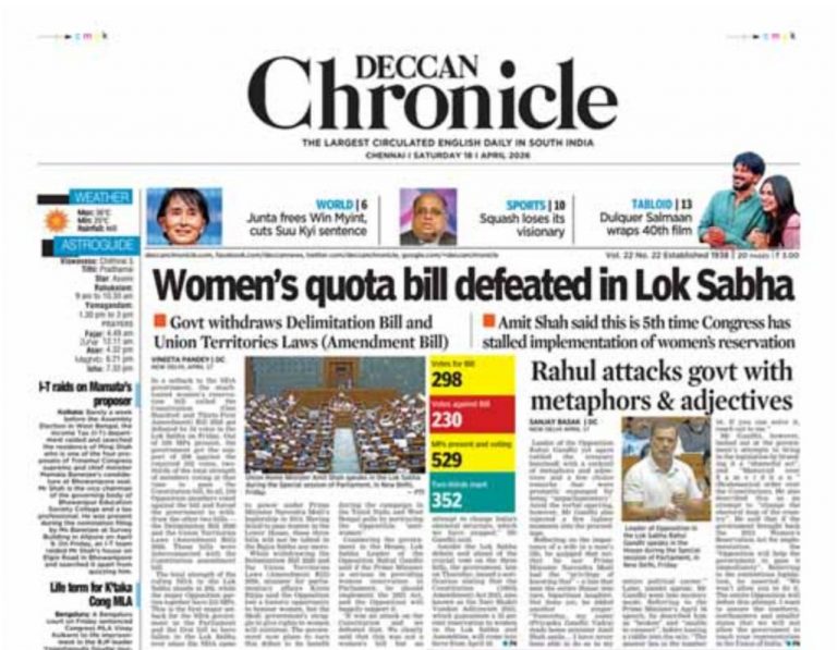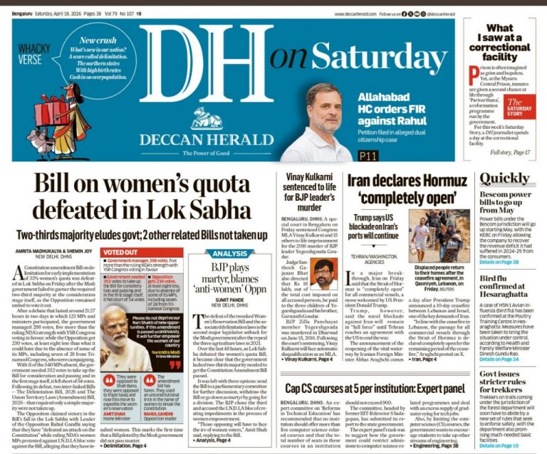डेक्कन हेरल्ड के साथ भी ऐसा ही है. पहले पन्ने पर, बड़े फ़ॉन्ट में, मुख्य ख़बर के टाइटल में कहा गया है, महिलाओं के आरक्षण पर विधेयक लोकसभा में हार गया, ये एक ऐसा दावा है जो बिल्कुल सच नहीं है.