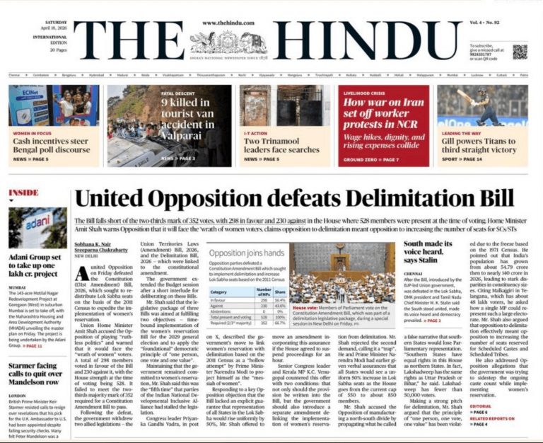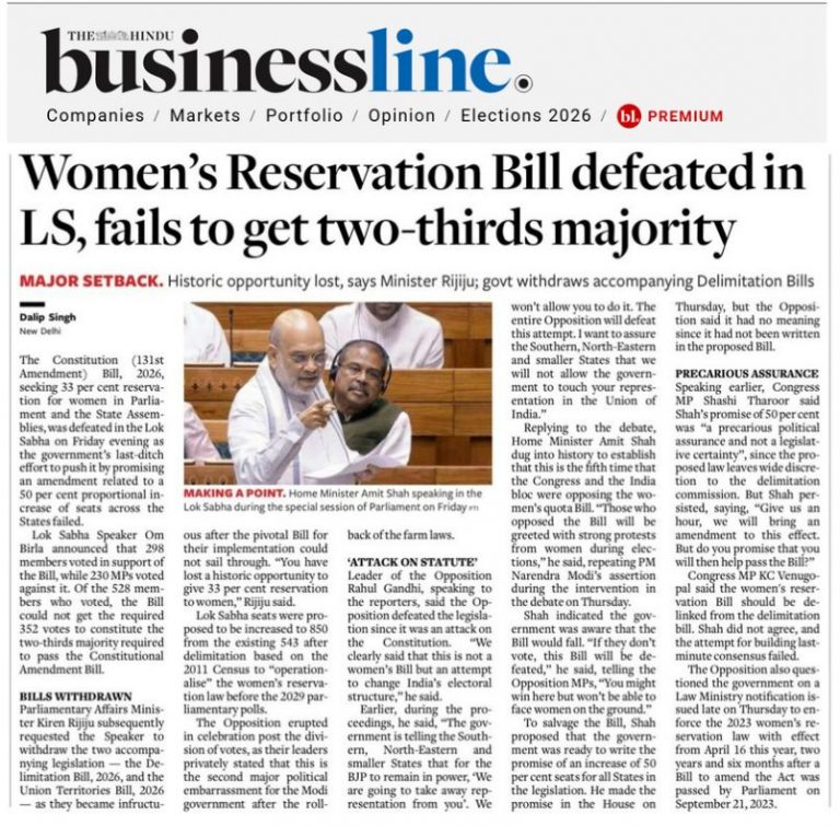 प्रमुख राष्ट्रीय दैनिक न्यूज़ पेपर्स में, द हिंदू एक उल्लेखनीय अपवाद के रूप में सामने आया, जिसने सटीक रूप से रिपोर्ट किया कि पराजित प्रस्ताव परिसीमन से संबंधित था, न कि महिला आरक्षण कानून से. द हिंदू के पेज-वन का शीर्षक था: संयुक्त विपक्ष ने परिसीमन विधेयक को हराया.