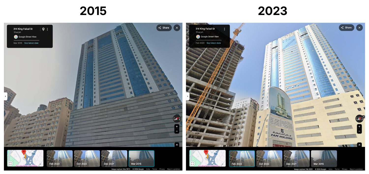 वीडियो में दिख रही लोकेशन की पुष्टि के लिए हमने गूगल स्ट्रीट व्यू की मदद ली. 2015 के स्ट्रीट व्यू हिस्ट्री से मिलान करने पर वायरल वीडियो वाली इमारत शारजाह की उसी लोकेशन से पूरी तरह मेल खाती है. वहीं, गूगल स्ट्रीट व्यू हिस्ट्री उसी जगह का 2021, 2022 और 2023 में कैप्चर हुए तस्वीर में उस जगह का नक्शा बदल चुका है, उस बिल्डिंग के डिजाइन में अंतर आ चुका है और आसपास और भी इमारतें बन चुकी है जो दिखाता है कि वायरल वीडियो और हाल की स्थिति में कथित जगह में अंतर है.