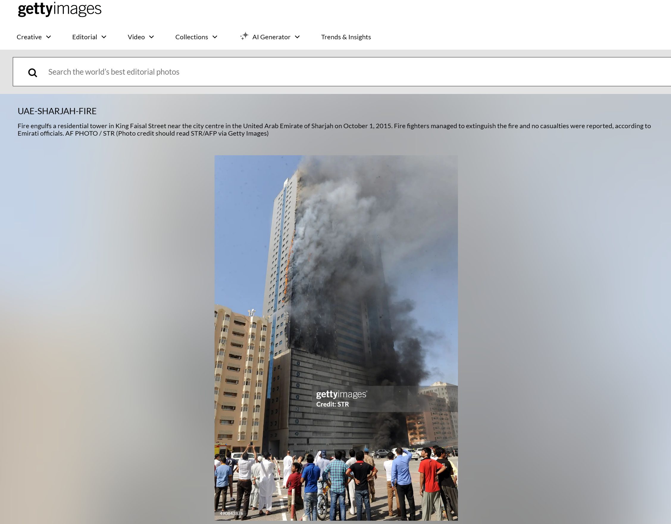 स्टॉक इमेज वेबसाइट getty पर भी 1 अक्टूबर 2015 की इस आगजनी की तस्वीरें मौजूद हैं. इन तस्वीरों का एंगल और इमारत की बनावट वायरल वीडियो से लगभग मेल खाती है. कैप्शन में लिखा है कि ये तस्वीर 1 अक्टूबर 2015 को यूनाइटेड अरब अमीरात शारजाह में सिटी सेंटर के पास किंग फैसल स्ट्रीट में एक रेजिडेंशियल टावर में लगी आग का है.