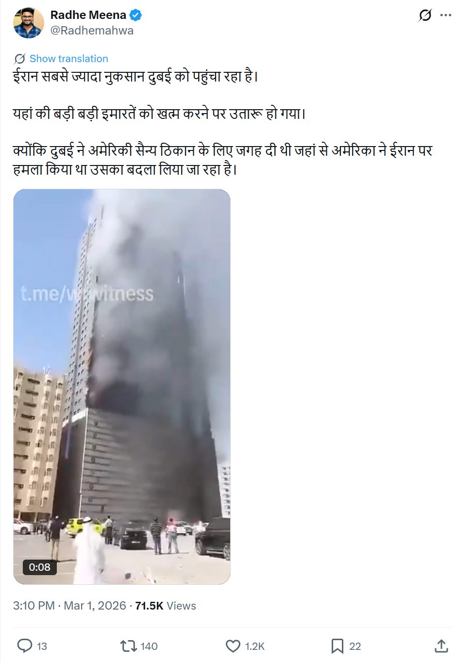 राधे मीणा नामक यूज़र ने ये वीडियो शेयर करते हुए दावा किया कि ईरान, दुबई को सबसे ज्यादा नुकसान पहुंचा रहा है और वहां की मुख्य इमारतों को नष्ट करने पर तुला है. (आर्काइव लिंक)