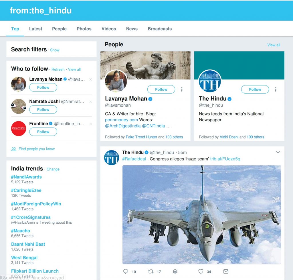 If you search for the tweets of any user, for example Alt News, all the tweets show up when you type “from:@altnews” in the Twitter search box. This functionality also allows users to search for certain key words. For example you can type “from:@altnews fake news” and you will get all the tweets from Alt News that contain the key words “fake news” in them. In the case of The Hindu, you had to go to their Twitter profile to view their tweets. Not appearing in search results limits the reach of the tweets and does not allow users to search for keywords.