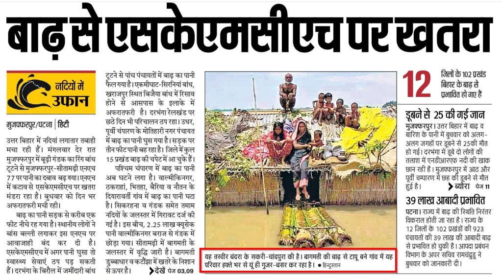 The image was published on the third page of the Muzaffarpur edition of Hindustan dated July 30, 2020, with the headline, “Flood threatens SKMCH.” We noticed that apart from the image caption, the family finds no mention in the article.