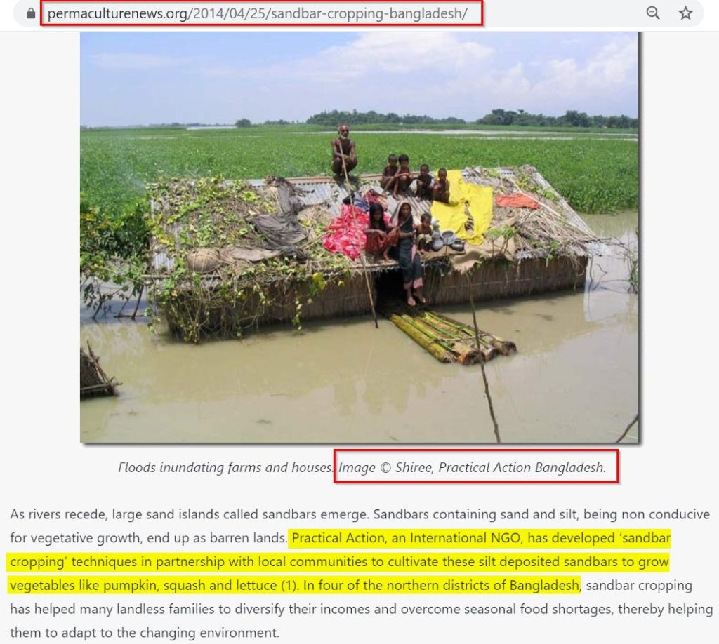 The image was also published in 2014 on a website called ‘Permaculturenews.org’ which wrote an article on sandbar cropping in Bangladesh. The picture is credited to Shiree (Stimulating Household Improvements Resulting in Economic Empowerment), an organisation working with Practical Action in Bangladesh.