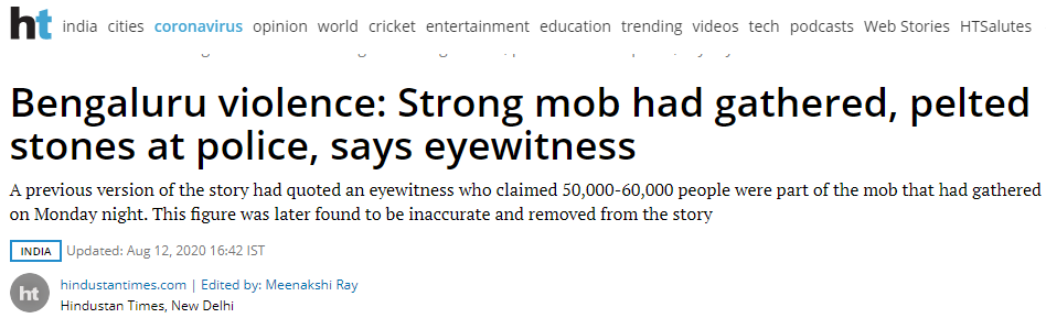 Reporting on the events from last night, Hindustan Times (HT) cited an ‘eyewitness’ account and published an article claiming “60,000-strong mob” had pelted stones at the police. “An eyewitness said on Wednesday there was a strong mob of 50,000 to 60,000, which pelted stones at police personnel and damaged property at a police station during the violence on Tuesday night in Bengaluru,” reported HT identifying the eyewitness as Sharif, who was part of the civil defence team aiding the police to pacify the crowd.