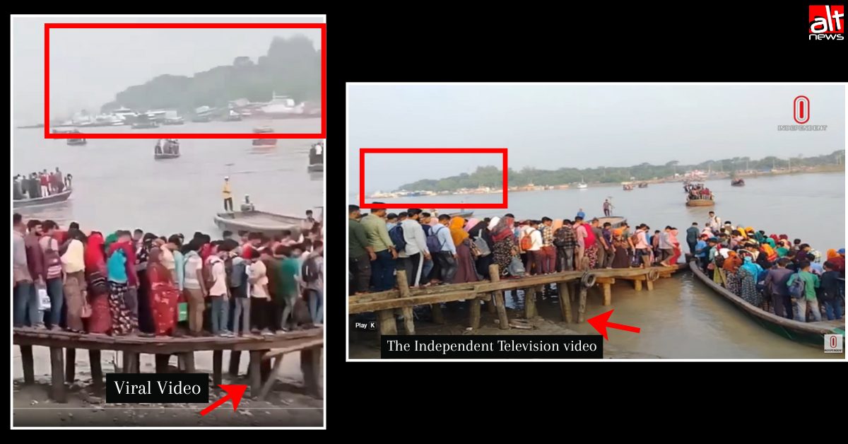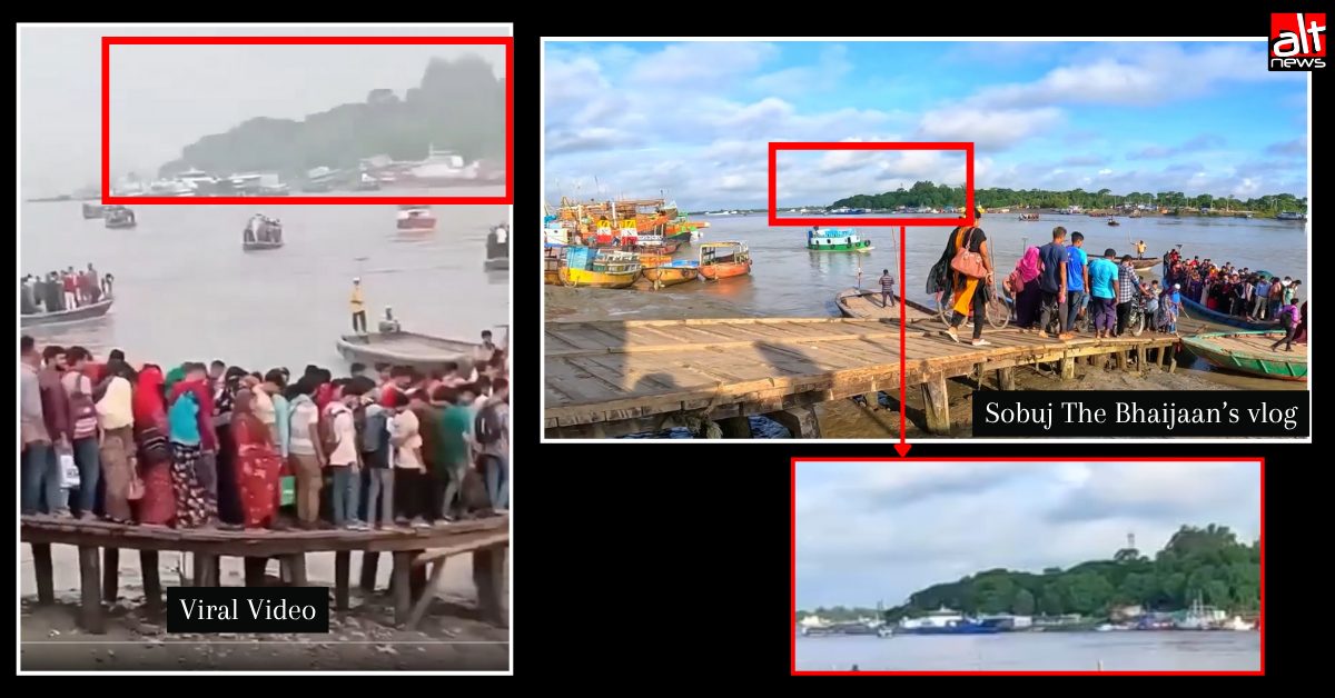 We also found a vlog by Sobuj the Bhaijaan, where he documents a ferry journey from Mongla river ghat. The background seen in his vlog aligns with the surroundings seen in the viral footage. See the comparison below.