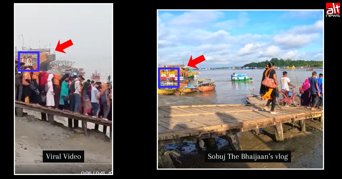 We also found a vlog by Sobuj the Bhaijaan, where he documents a ferry journey from Mongla river ghat. The background seen in his vlog aligns with the surroundings seen in the viral footage. See the comparison below.