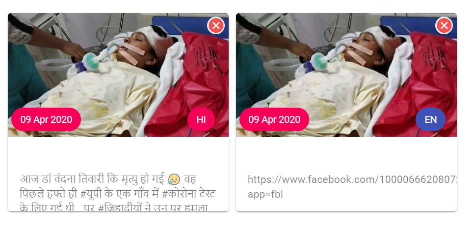 [Translated from: “आज डां वंदना तिवारी कि मृत्यु हो गई वह पिछले हफ्ते ही UP में कोरोना टेस्ट के लिए गई थी पर इस्लामिक जिहादीयों ने उन पर हमला कर गंभीर रूप से घायल कर दिया था आज उनकी मौत हो गई।”]