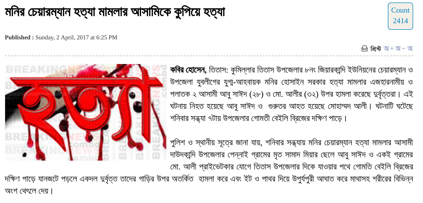 On April 1st, unknown assailants killed Abu Syed & seriously injured Md Ali, two men who were wanted for the murder of Awami League leader Monir Hossain Sarkar. This incident happened in Titas subdivision of Coomilla district in Bangladesh. The issue was also covered by the local news website called Coomilla-r-Kagoj which translates to “Coomilla’s Newspaper”.