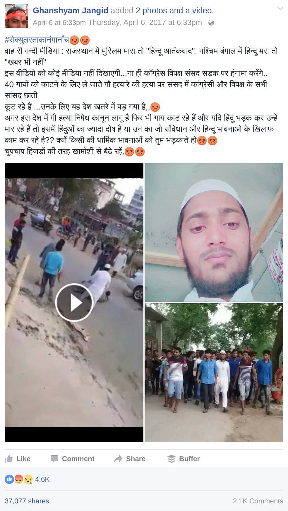 This video is now being circulated by the right-wingers as a Hindu being killed in West Bengal by Muslims. At the time of writing, a cock and bull post by one Ghanshyam Jangid has been already shared over 37000 times on Facebook. This same video is also viral as a Hindu killed in Nawada, Bihar, and we wrote about this yesterday.