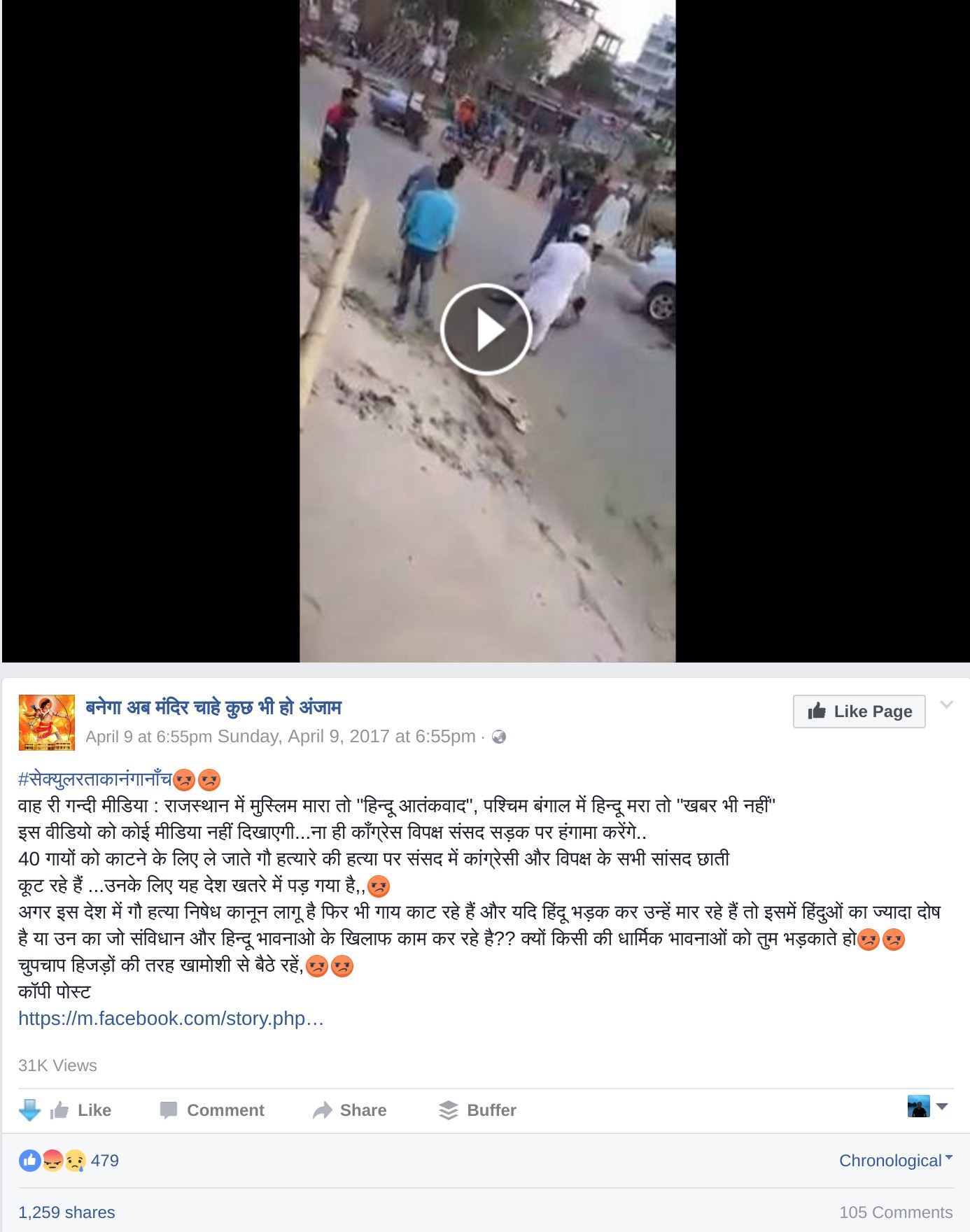 What is happening here is that to cover up the ghastly murder of Pehlu Khan in Alwar, the right-wingers are not only propagating complete falsehoods regarding the incident itself, they also want to justify the murder of Pehlu Khan by showing a fake video of a Hindu being killed in West Bengal and cry wolf as to how no one is talking about it. The video that was shared by Ghanshyam Jangid was downloaded by many others on social media and shared again via their individual social media accounts and pages with the identical text thus resulting in lakhs of views.