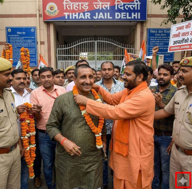 A photograph of ex-BJP MLA and Unnao rape-convict Kuldeep Singh Sengar being garlanded by a man in saffron clothing outside Delhi’s Tihar Jail is viral. He is surrounded by a group of men, including police officers.