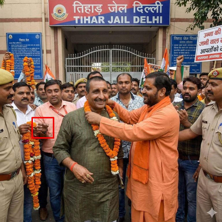 To sum up, 2017 Unnao rape convict Kuldeep Singh Sengar has not been released from jail. The photograph showing him being garlanded outside Delhi’s Tihar Jail is AI-generated.