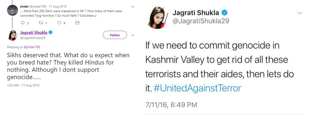 Lok Sabha TV’s, Jagrati Shukla is in a controversy over her tweets once again. At the time of writing this article, her Twitter account shows up as “Suspended”. Reacting to images of pellet gun injuries of civilians, Shukla tweeted, “Wow, that’s so cool. Would have preferred real bullets instead of pellets. The results would have been much better”. Shukla’s tweet, which amounts to a call for extrajudicial killings in Kashmir, has found support among her right wing followers and has promoted feelings of enmity and hatred against Kashmiris. The comments to her post range from hate mongering to open calls for elimination of Kashmiris.