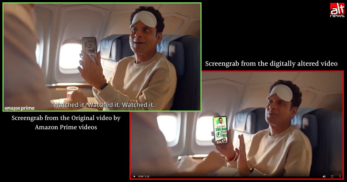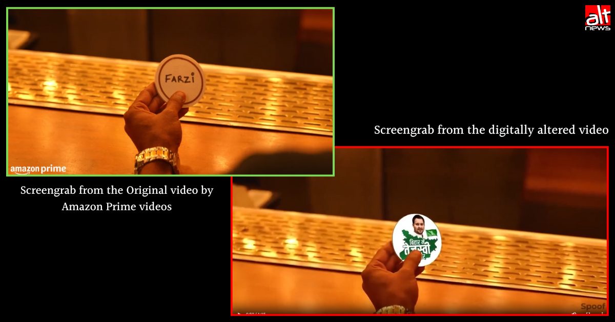 In the doctored version, a few scenes were digitally altered to include visuals of Tejashwi Yadav’s campaign. In one frame, a woman hands a note to Bajpayee. In the original scene, the note features “Farzi” (an Amazon Prime original series) written on it. This is replaced by Tejashwi Yadav’s campaign image. In another altered frame, Bajpayee shows his phone to an airhostess, which featurs Tejashwi Yadav’s campaign slides.