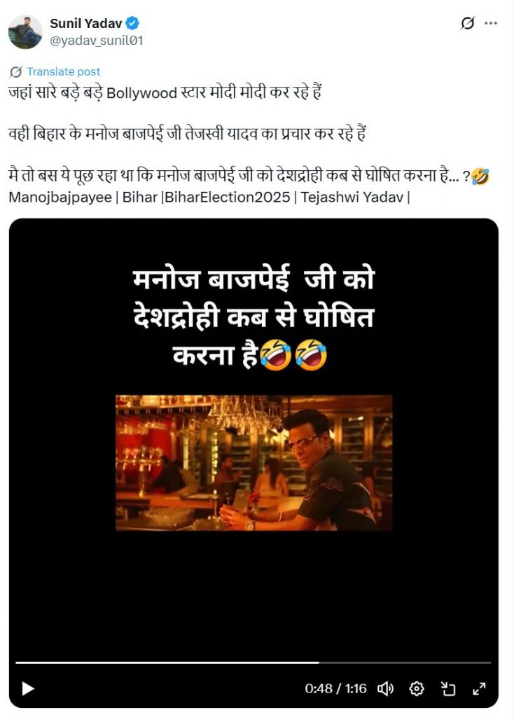 X user Sunil Yadav, who describes himself as “not secular” in his bio, shared the video clip stating that where multiple Bollywood actors were chanting ‘Modi Modi’, Bajpayee, originally from Bihar, was campaigning for Tejashwi Yadav. (Archive)