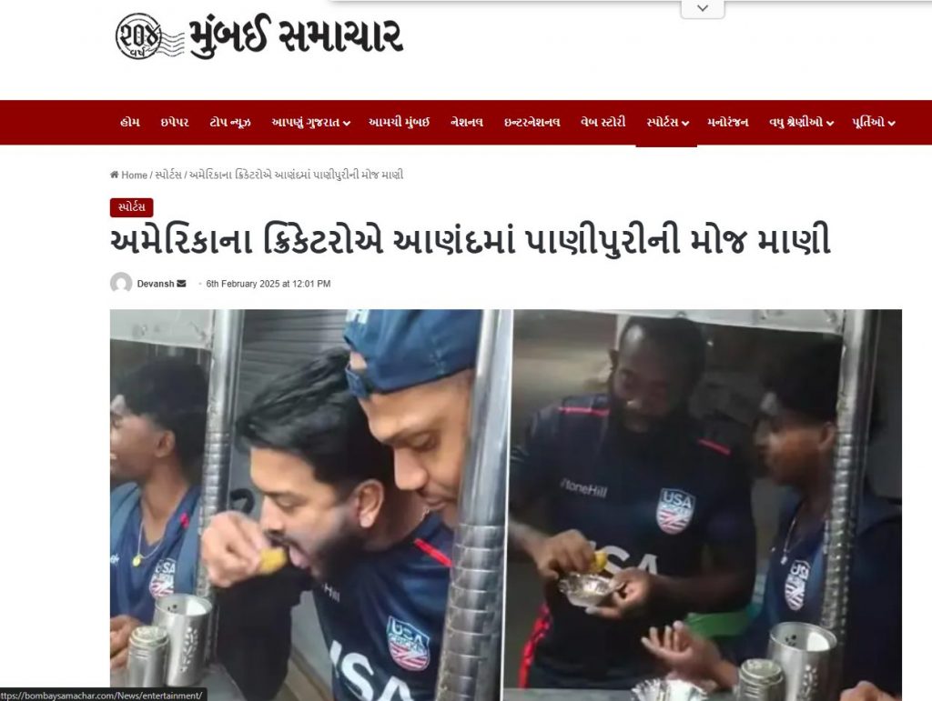 A simple reverse image search on a few key frames of the video led us to a news report by Bombay Samachar from February 6, 2025. The report featured screenshots from the now-viral video. The headline said “અમેરિકાના ક્રિકેટરોએ આણંદમાં પાણીપુરીની મોજ માણી” (“American cricketers enjoyed Panipuri in Anand”). (Archive)