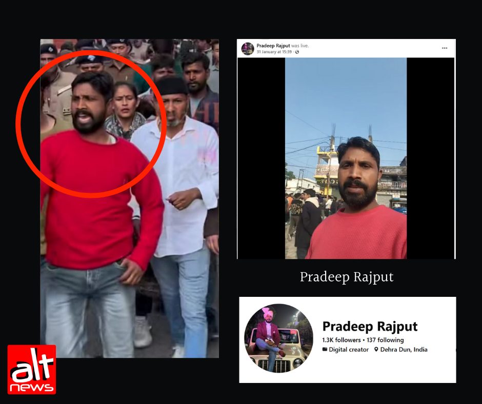Alt News found an Instagram video posted by user @dehradun_exclusive of the protests that were held on January 31. In it, a large crowd of people can be seen marching while several men, who proclaim to be Bajrang Dal workers, issue threats to Kumar using expletives outside a gym that he owns. Some police personnel can be seen at the spot. One man jumps over policemen in an attempt to reach Kumar, standing at a distance, and several others follow.