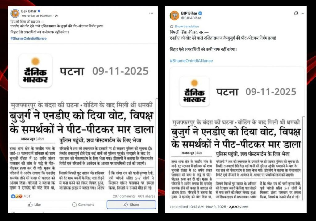The Bihar BJP Facebook page and X handle on November 9 shared a screenshot of a Dainik Bhaskar report which said that an elderly Dalit man voted for the BJP-led NDA in the Bihar polls and had been beaten to death by the Opposition.