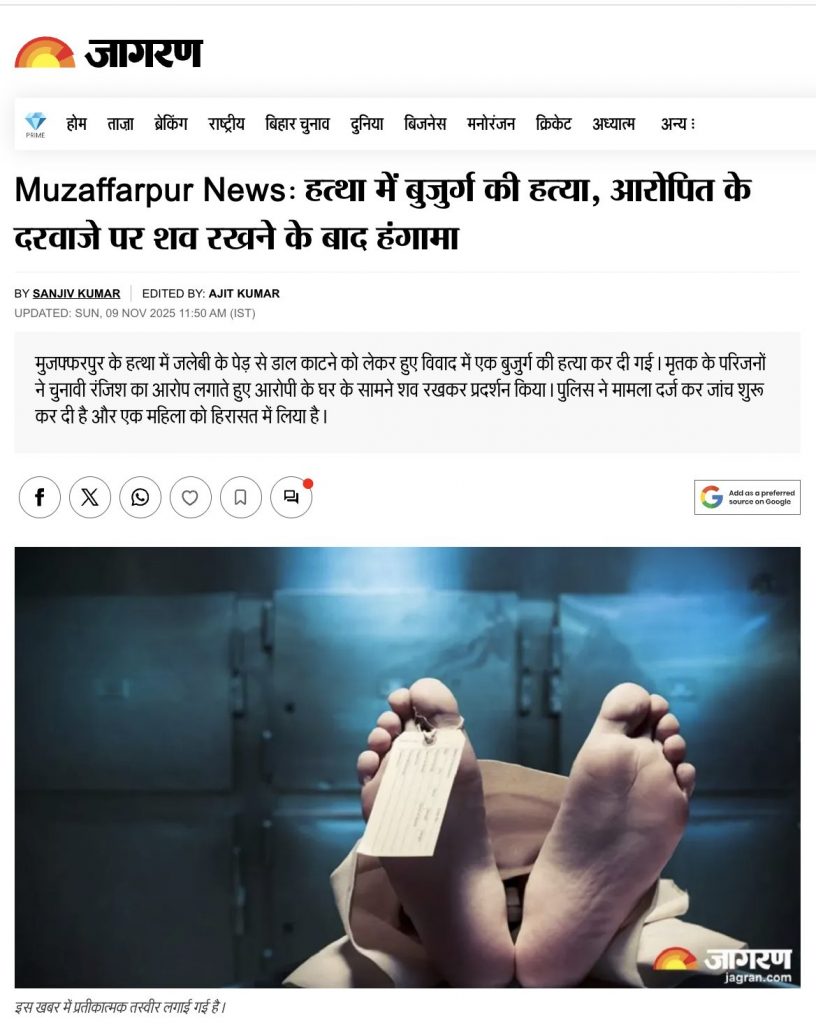 A keyword search led us to a Jagran report published on November 9, 2025, on the same incident. According to the report, upon receiving information about the incident in Sakhaura Patsara village in the Hattha police station area of Muzaffarpur district, Hattha police station chief Lokesh Kumar Chaudhary, Piar police station chief Rajnikant, Sakra police station chief Sukhwinder Nayan, and SDPO Manoj Kumar Singh started an investigation. The deceased’s family alleged that the incident was the fallout of an election rivalry, but police denied this.