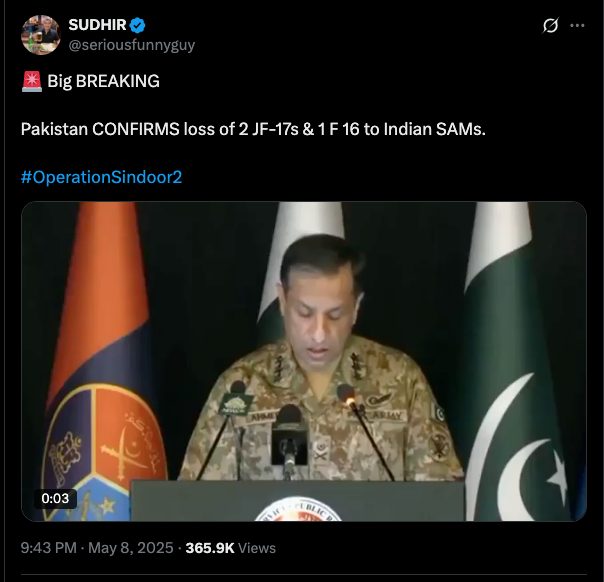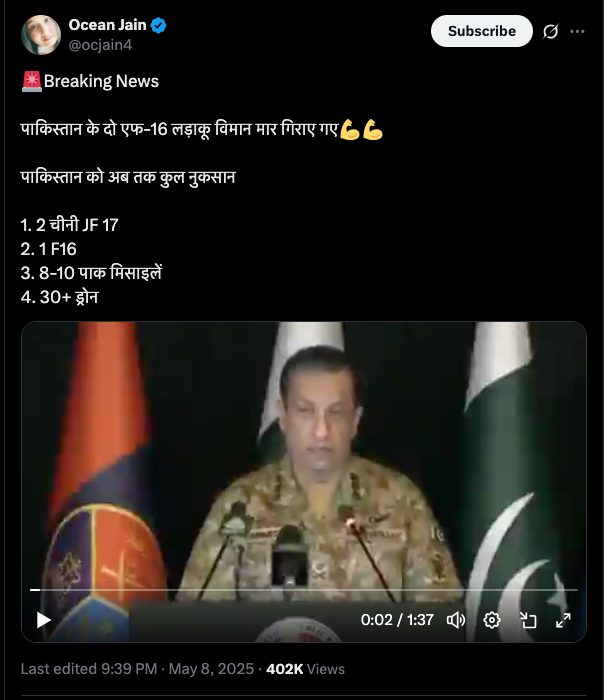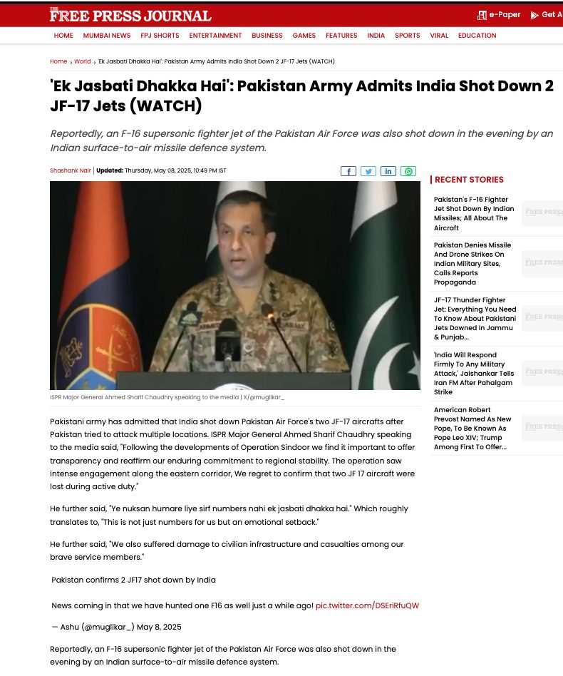 On May 8, News18 Bangla shared a portion of this clip on their broadcast, stating that Pakistan officials confirmed the loss of two JF-17 aircraft. The video has now been taken down.