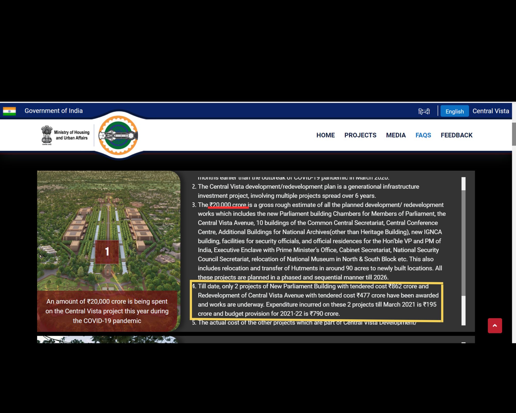 However, the website mentions that “Till date, only 2 projects of New Parliament Building with tendered cost ₹862 crores and Redevelopment of Central Vista Avenue with tendered cost ₹477 crores have been awarded and works are underway.” The government is yet to update the website with the revised version of the increase in the construction costs of the building.