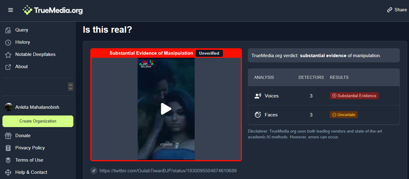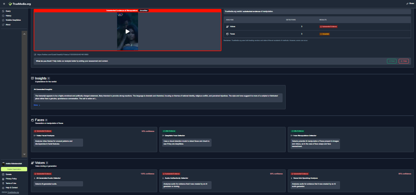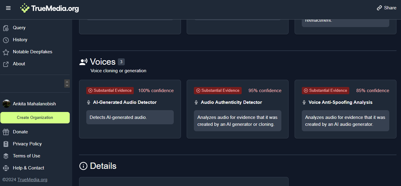 Finally, to confirm the source of the voice further, we checked the video with an AI detection tool, Truemedia.org. The tool detected the voice used in the video as 100% AI-generated.
