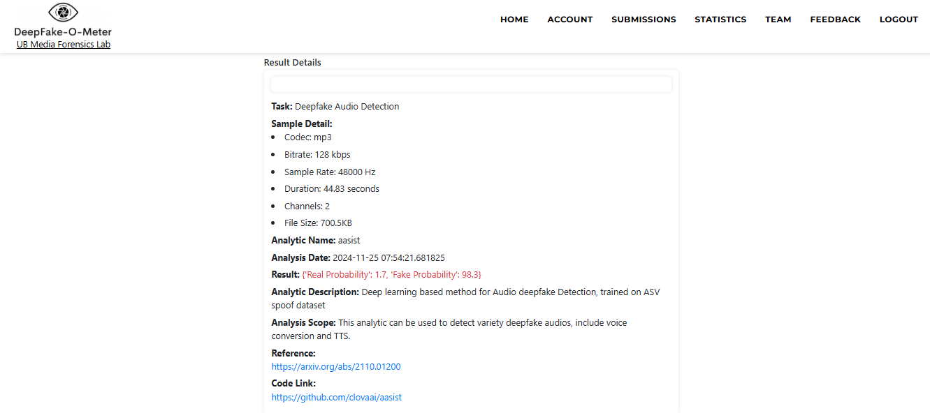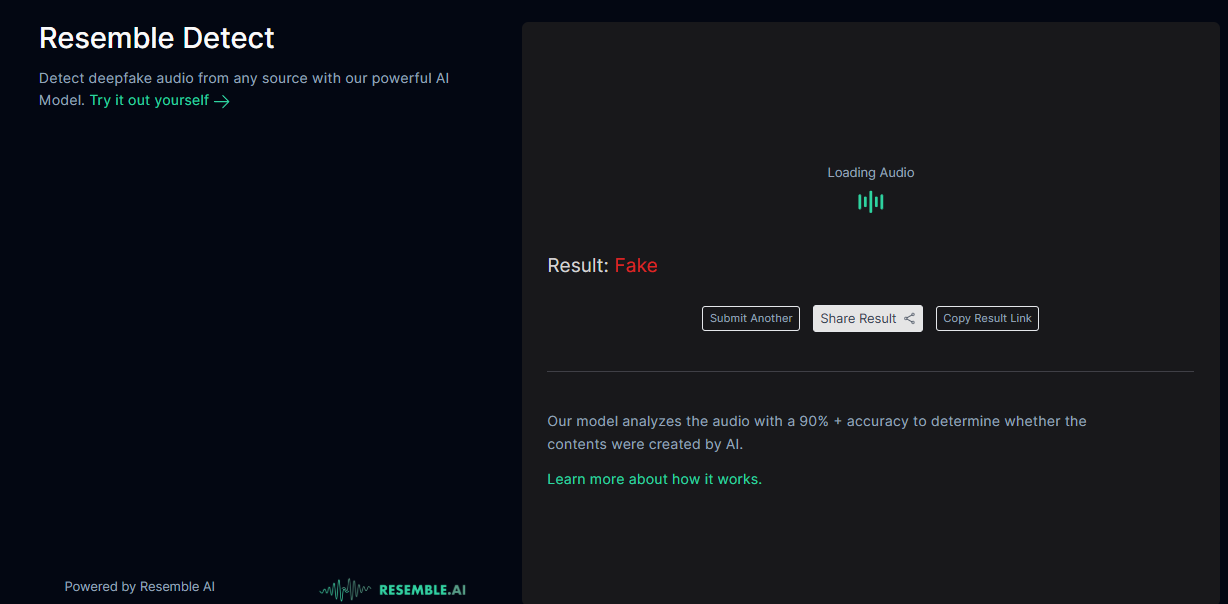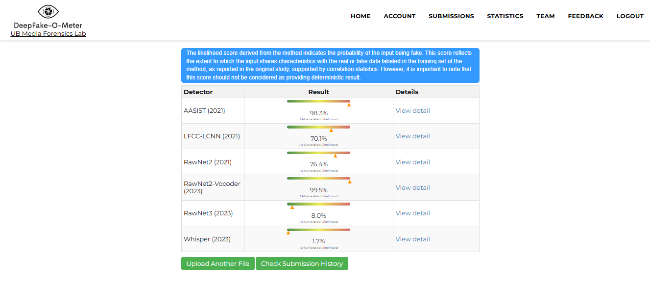 We tried a few other AI-detection tools, such as, Deepfake-o-meter and Resemble detect. All of them showed a high probability that the audio was not authentic.