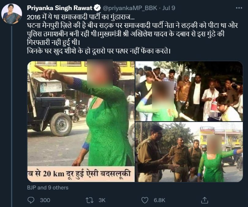 BJP Uttar Pradesh state general secretary Priyanka Singh Rawat tweeted the photos, writing, “This was the Samajwadi Party’s hooliganism in 2016…In an incident from Mainpuri district, a Samajwadi Party leader had assaulted a girl in broad daylight while the police were silent spectators. This goon was not arrested due to political pressure from chief minister Akhilesh Yadav. Those who live in glass houses should not throw stones at others.” It amassed 2,647 retweets at the time of writing. (Archive link)