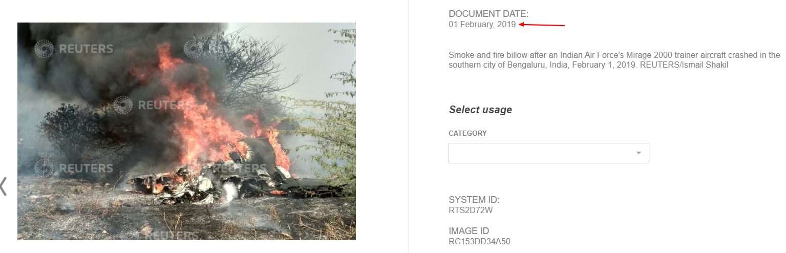We then looked for the image on Reuters pictures and found that it dates back to February 2019. “Indian Air Force’s Mirage 2000 trainer aircraft crashed in the southern city of Bengaluru,” reads its description.