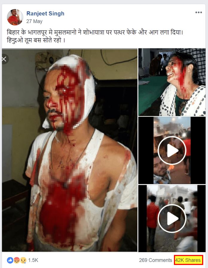“बिहार के भागलपूर मे मुसलमानो ने शोभायात्रा पर पत्थर फेके और आग लगा दिया। हिन्दुओ तूम बस सोते रहो । हिन्दु कि औलाद हो तो 1,2,3 जितने भी Group है share करो” (In Bhagalpur, Bihar, Muslim pelted stones at the Shobha Yatra and had set fire to it. Hindus you just keep sleeping. If you are a child of Hindu, then share it to 1, 2, 3 whatever groups you have -translated) A Facebook user, रायल संजय सिंह राजपूत (Royal Sanjay Singh Rajput) has shared two images and videos with the aforementioned text in a Facebook group, नरेन्द्र मोदी 2019 (साथ हैं तो जुडे़). At the time of writing, the post has been shared more than 7400 times. It may be noted that the Facebook group has more than 8,41,000 members.