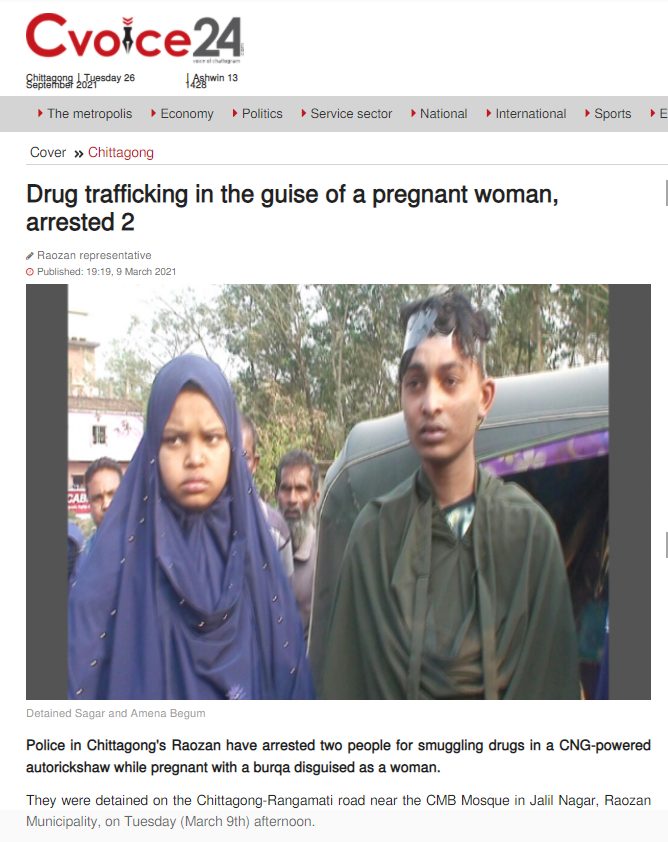 We also performed a keyword search and came across an article by Chittagong news outlet Cvoice24 dated March 9, 2021. It quoted the Office-in-Charge of Ravzan Police Station as saying that the police were stationed at a check post and were searching all passengers. They discovered that an individual seated inside an auto was not a woman but a man smuggling liquor in the guise of being pregnant.