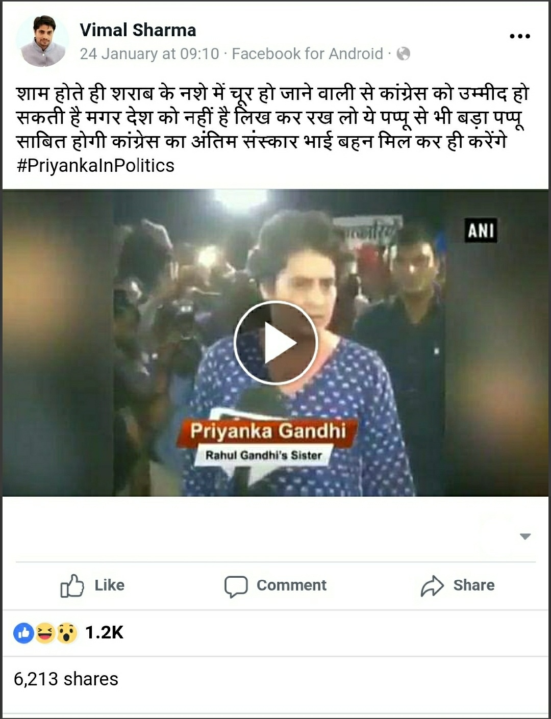 “शाम होते ही #शराब के नशे में चूर हो जाने वाली से #कांग्रेस को उम्मीद हो सकती है मगर देश को नहीं है (Congress can have their hopes on those who get drunk every evening but the country cannot. -translated)”A video of Priyanka Gandhi speaking angrily with people at what seems like a public gathering has gone viral on social media. The text circulated along with the video suggests that she can’t be trusted as a politician since she is an alcoholic. Humlog, a Facebook page has posted the video with the same text. It has been viewed more than 98,000 times and shared more than 3,900 times so far.