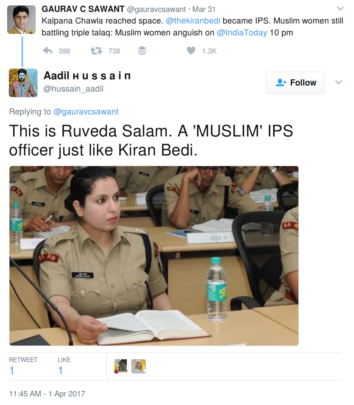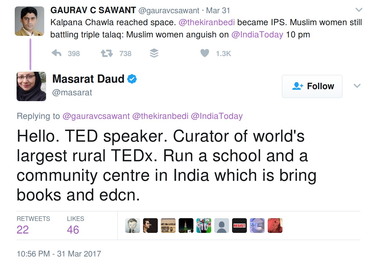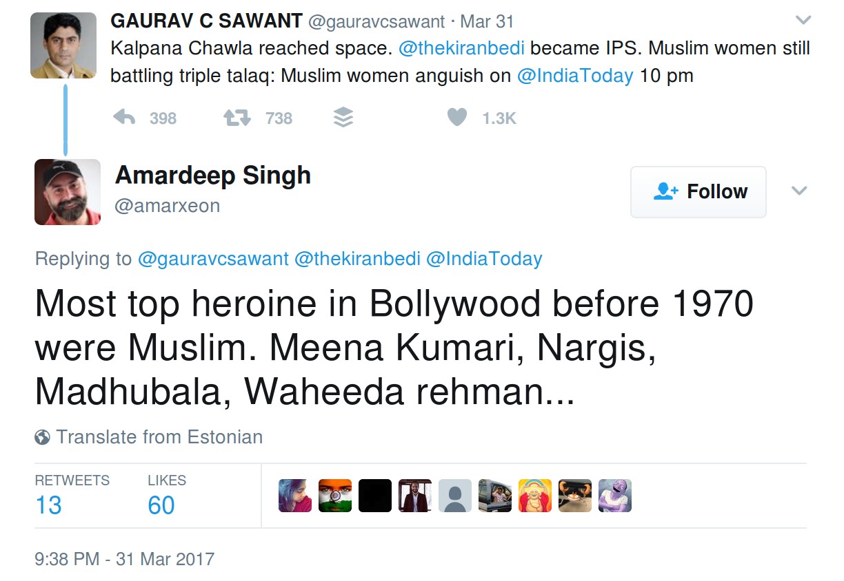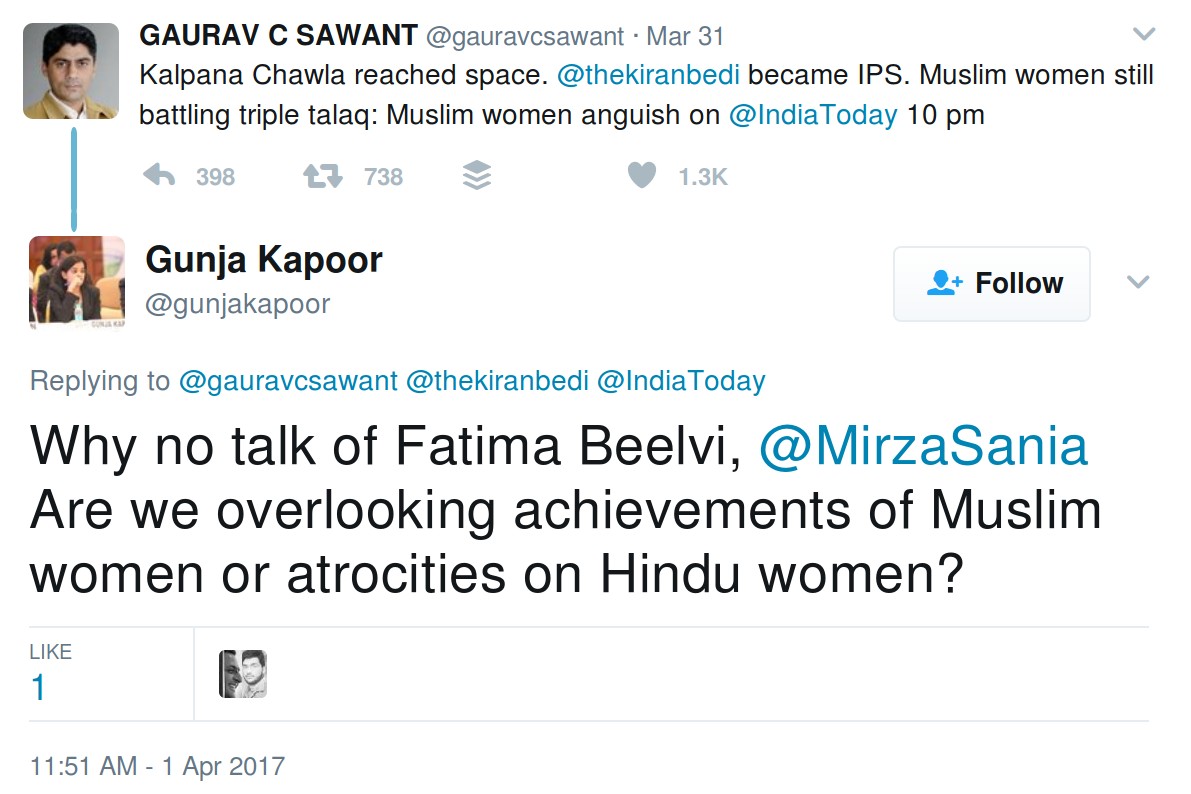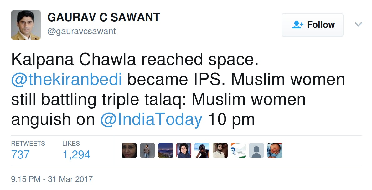 On 31st March Gaurav tweeted “Kalpana Chawla reached space. @thekiranbedi became IPS. Muslim women still battling triple talaq: Muslim women anguish on @IndiaToday 10pm.” After this, he posted two more tweets which were similar in nature.