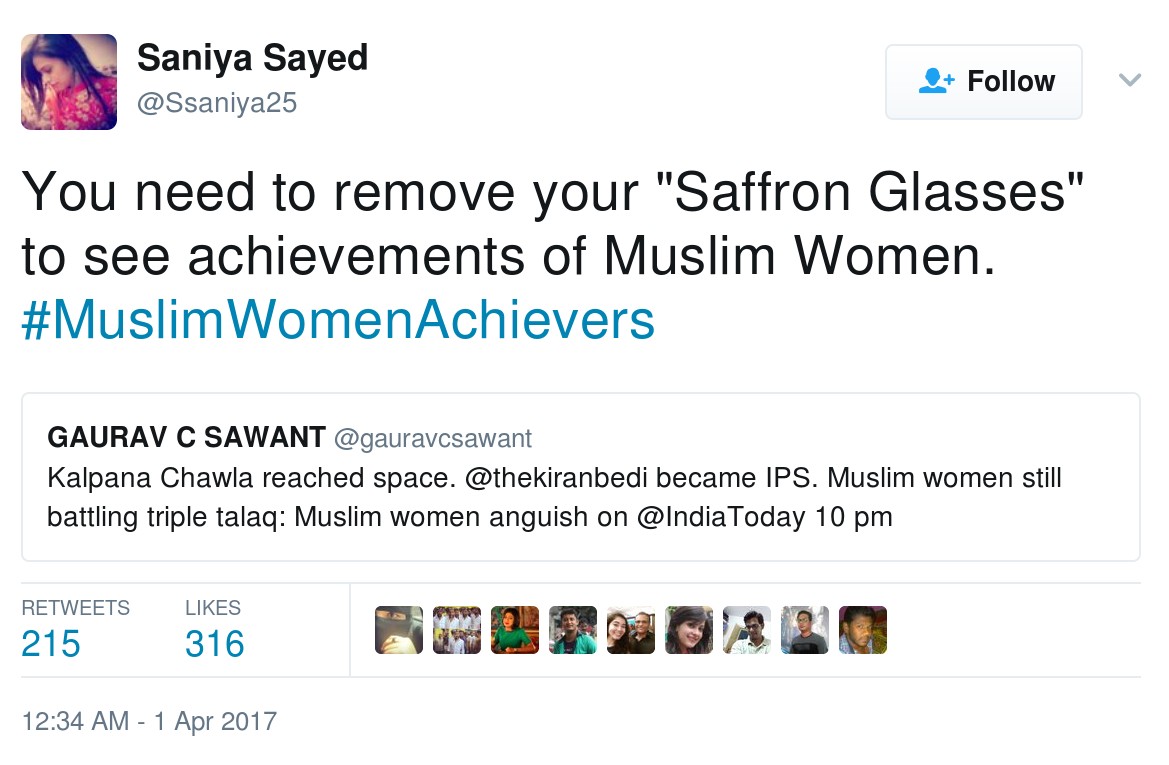 Does Gaurav Sawant not know these Muslim women? Is he an idiot? Or is he ailing from the same sick mentality that has spread amongst the journalist fraternity in India? One twitter user Saniya Sayed told Gaurav Sawant that the achievements by Muslim women will only be visible to him, once he takes off his saffron glasses. Having noticed Gaurav Sawant’s journalism for a while, Saniya’s words ring true. But will Gaurav Sawant ever shed his saffron glasses? It does not seem so.