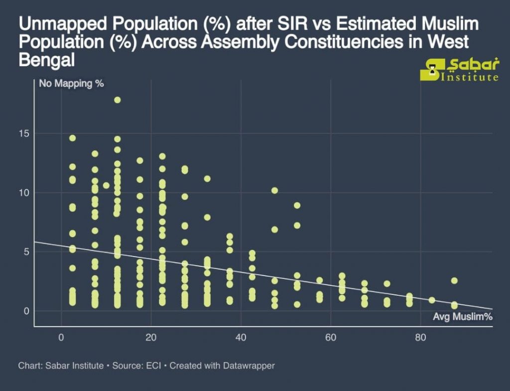 The data itself is revealing. According to the list published in December, areas with large Muslim populations recorded very high mapping percentages. In districts like Malda, Murshidabad and other border regions, less than 2% of the Muslim population remained unmapped. In other words, a significant majority of Muslim voters were able to successfully link themselves to the 2002 voter list and submit the required documentation.