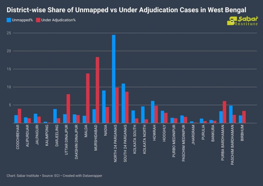 Even in constituencies such as Domkal and Farakka in Murshidabad district, the adjudication rate is extraordinarily high, ranging between 50% and 60%, further underscoring the uneven impact.