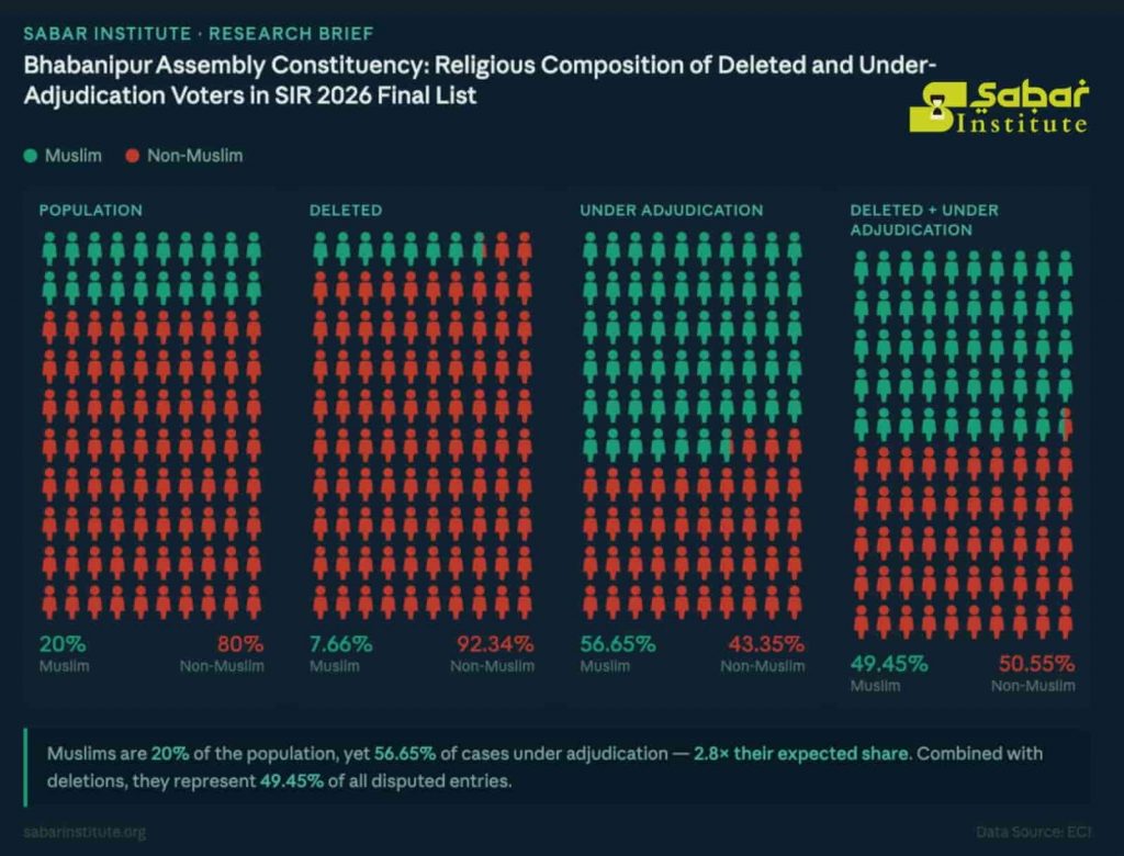 Alt News’s data analysis (here and here) of six assembly constituencies showed that an overwhelming majority of under-adjudication (UA) voters were Muslims. In Manikchak, where Hindus and Muslim voters are almost exactly equal in number, 97.4% of all voters placed under adjudication are Muslim. In Mothabari: 69.5% Muslim voters. 97.4% of UA voters are Muslim. In Samserganj: 82% Muslim voters. 98.8% of UA voters are Muslim. In Baharampur: 26.9% Muslim voters. 61.6% of UA voters Muslims. In Bhabanipur, Muslims constitute 22% of total voters. Among those placed under adjudication, they are over 51%. In Ballygunge, 54% Muslim voters, 76% Muslims among voters placed under adjudication.