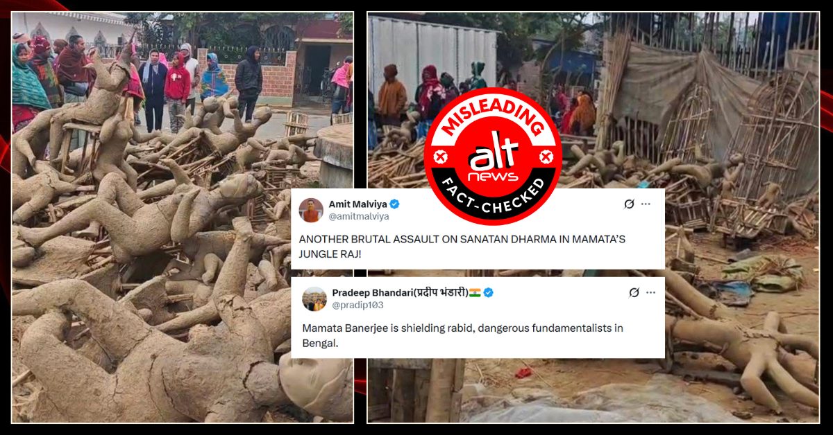Images depicting unfinished idols of Hindu deities Kali and Saraswati lying desecrated are viral on social media with the claim that the vanadlism in Santipur, West Bengal, was a “direct…