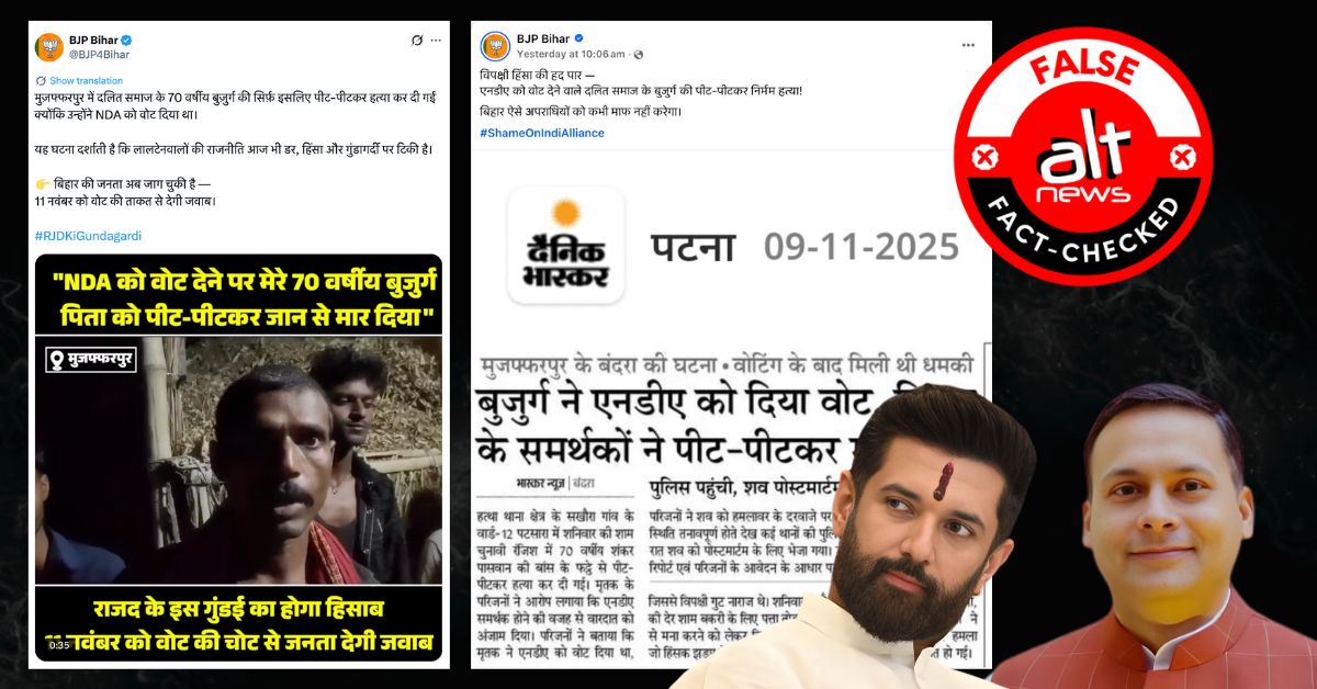 The Bihar BJP Facebook page and X handle on November 9 shared a screenshot of a Dainik Bhaskar report which said that an elderly Dalit man voted for the BJP-led NDA in…
