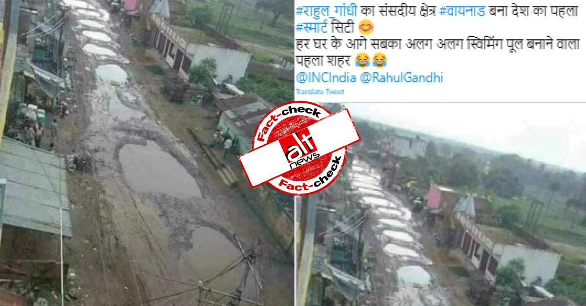 A photograph of a road filled with potholes has been shared by several users on social media with the claim that this is Congress MP Rahul Gandhi’s constituency Wayanad. “#राहुल_गांधी…
