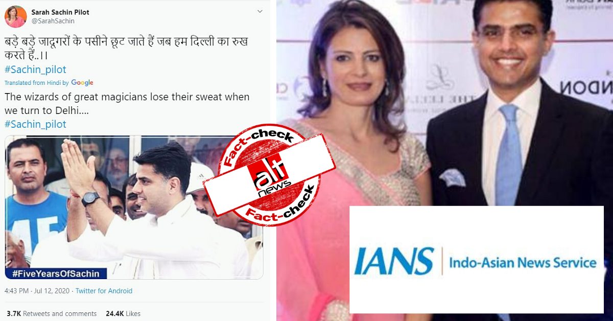 A section of the media republished a report by news agency IANS claiming that rebel Congress leader Sachin Pilot’s wife Sara Pilot in a series of tweets tagged to Congress…