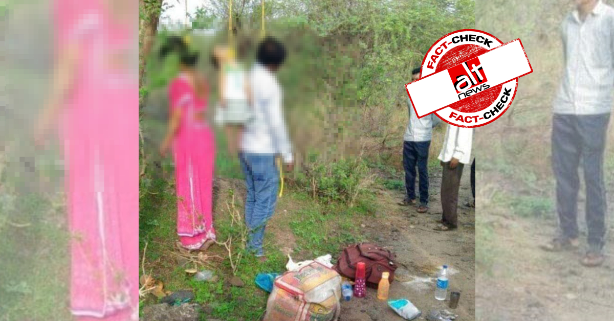 A photograph of a man, woman and infant hanging dead from a tree has been widely shared on social media. The accompanying claim suggests that the family committed suicide out…