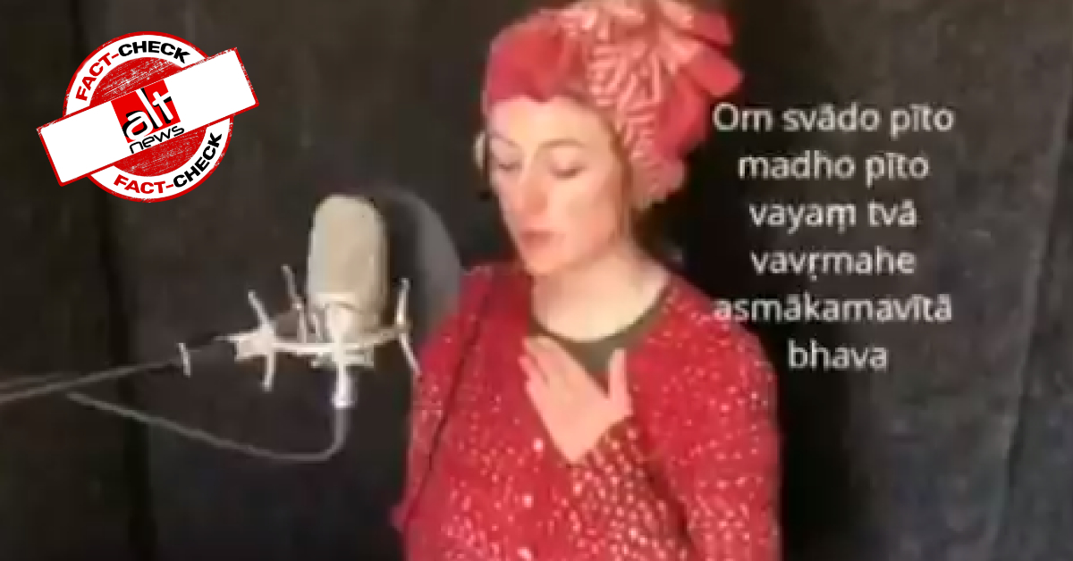 A 2:20-minute video of a caucasian woman singing Sanskrit verses has gone viral with Hindi text, “This is sung on Spain’s radios in the morning. [Translated from स्पेन के रेडियो…