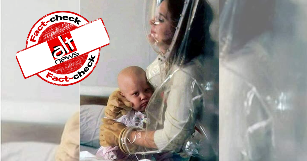 Photo from 1985 where mother in protective gear holds her baby given coronavirus spin